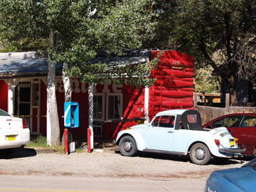 This appeared to be a private home, made from an old Santa Fe RR box car. Note the funky modified VW in this view as well. I am not sure what the advantage would be for the canvas instead of a rear window and roof.