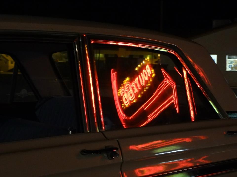 At our motel, The Route 66 Motel, this is a reflection of the motel sign on the window of an early 60s Ford Falcon. On Route 66 in Kingman, AZ.