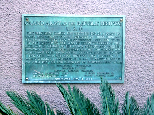 Perhaps because this was the longest US-numbered highway, perhaps because the Grand Army of the Republic organization had adopted it, someone installed a plaque to mark the end of the highway. It was dedicated in May, 1953 and reads, in part, “This monument marks the western end of a coast to coast highway, extending a distance of three thousand six hundred fifty-two miles, through fourteen states.” The occasion was a gathering of five service-related organizations, including the Sons of Union Veterans of the Civil War. The plaque was originally located in front of the Municipal Auditorium, but when that building was demolished sometime in the 1960s, it was moved to the Long Beach Performing Arts Center. It’s interesting to note that neither of these buildings was out at the corner of the Pacific Coast Highway and Atlantic Avenue, where maps have shown the actual end of the route. Because of this, some have theorized other locations for the original end of US-6, such as the interchange of the Long Beach Freeway at Pacific Coast Highway, or the Los Alamitos traffic circle, or even south of the Pacific Coast Highway at the Performing Arts Center. At any rate, it the end of my US-6 Roadtrip!