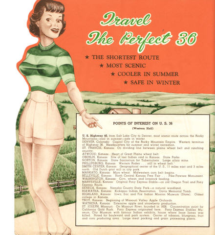 From a brochure that I believe was printed in 1949 or 1950. The route touting lass appears on both sides of the front cover (this is the inside) and the paper is actually cut to trace her silhouette.