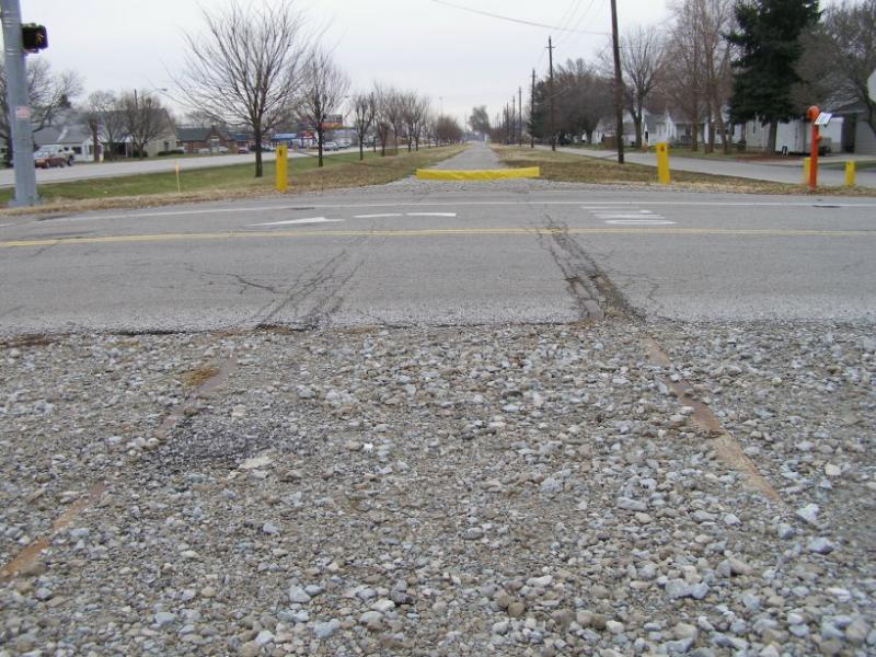 Old US 136: Looking east at the remains of the old Peoria & Eastern Railroad Line crossing Winton Ave., Speedway. 136 parallels on the left.