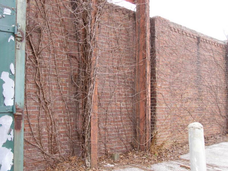 Old US 52/136: Bush Stadium brick wall with ivy (Pic taken in January...not yet green!). The ivy here inspired the owners of Wrigley Field to add it to their walls. Victory Field/Bush Stadium was built in 1931 and was home to the Indianapolis Indians. Many of the greatest players to ever play baseball played on its field while on their way to the majors. A great photo of Bush prior to its closure can be found here: http://www.minorleagueballparks.com/bushnite.jpg