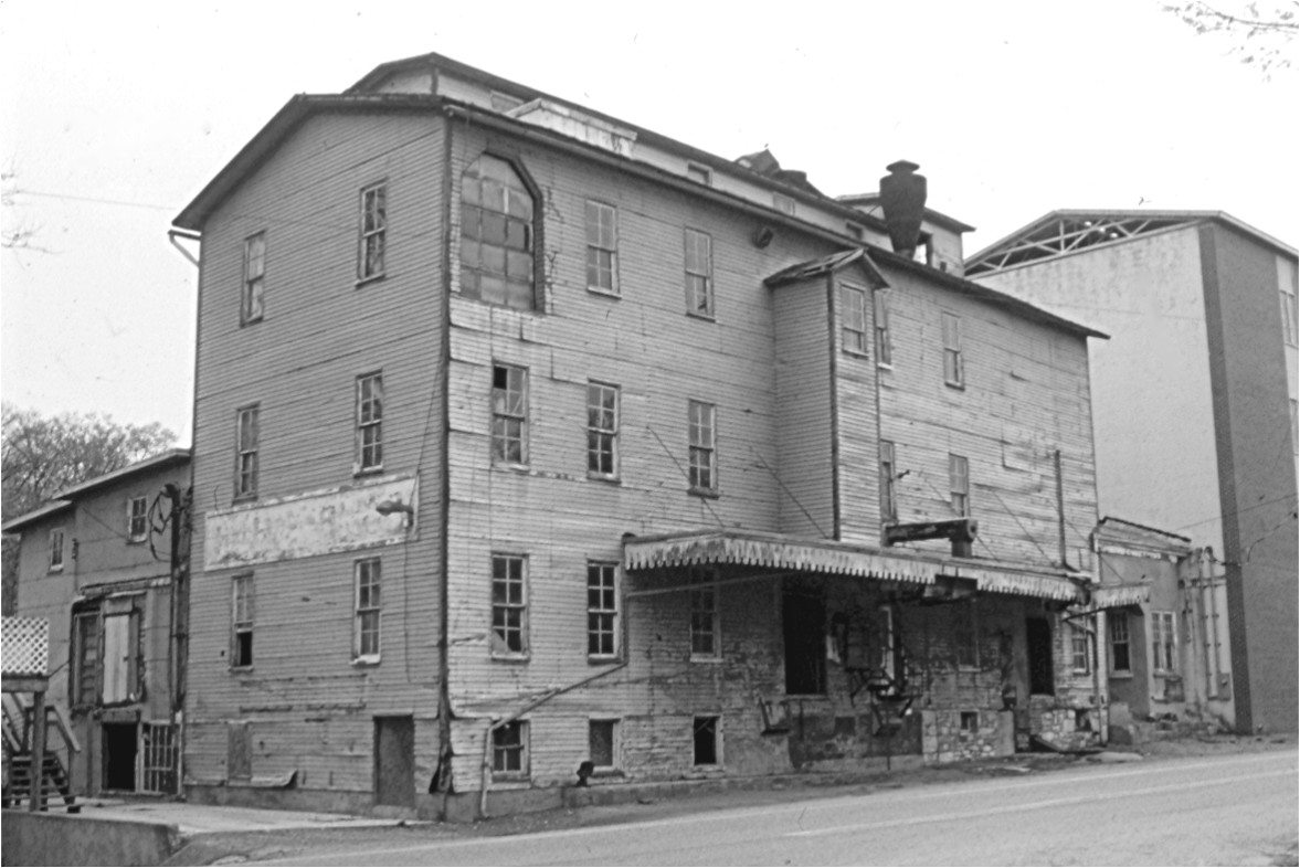 Old mill at Beaver Creek Bridge, wooden portion razed shortly after photo was made. Newer brick part at far right survives as storage for a tire retailer.