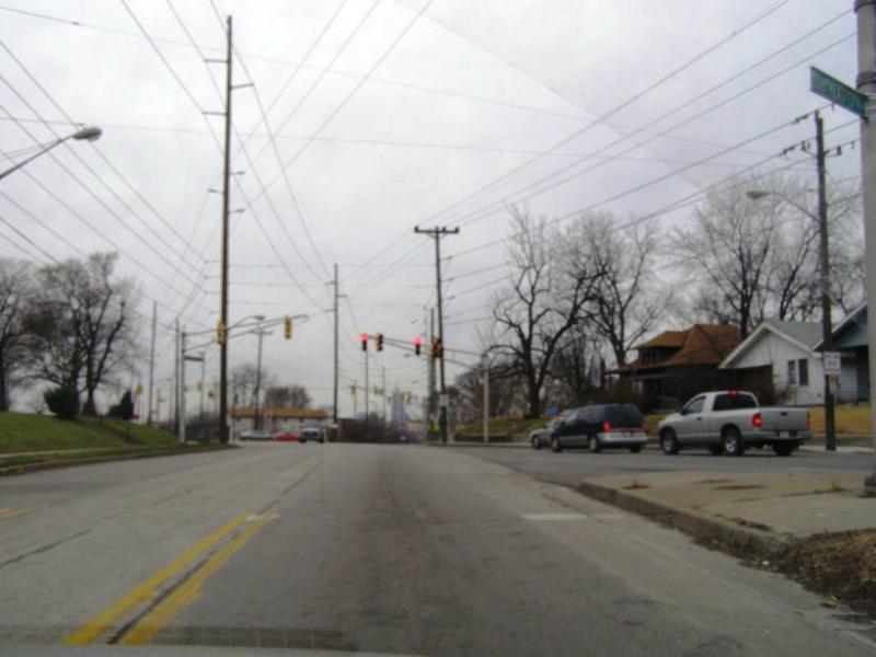 Old US 421: Intersection approaching downtown from the southeast. 421 continues on Southeastern Avenue and at this point shares pavement with old US 52 (coming in from the right).
