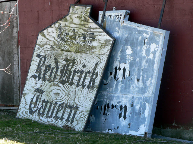 Signs that once hung in front of the Red Brick Tavern in Lafayette, Ohio, are now leaning against the building. Picture taken March 18, 2006.
