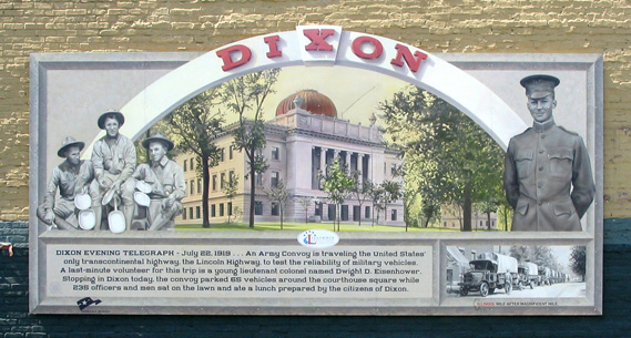 One of 43 murals commissioned by Illinois Lincoln Highway Coalition to commemorate historical moments on along the famous roadway. This mural is featured in the city of Dixon, Illinois and features a visit by a young army officer named Dwight David Eisenhower who would later sign into law the Federal-Aid Highway Act of 1956.