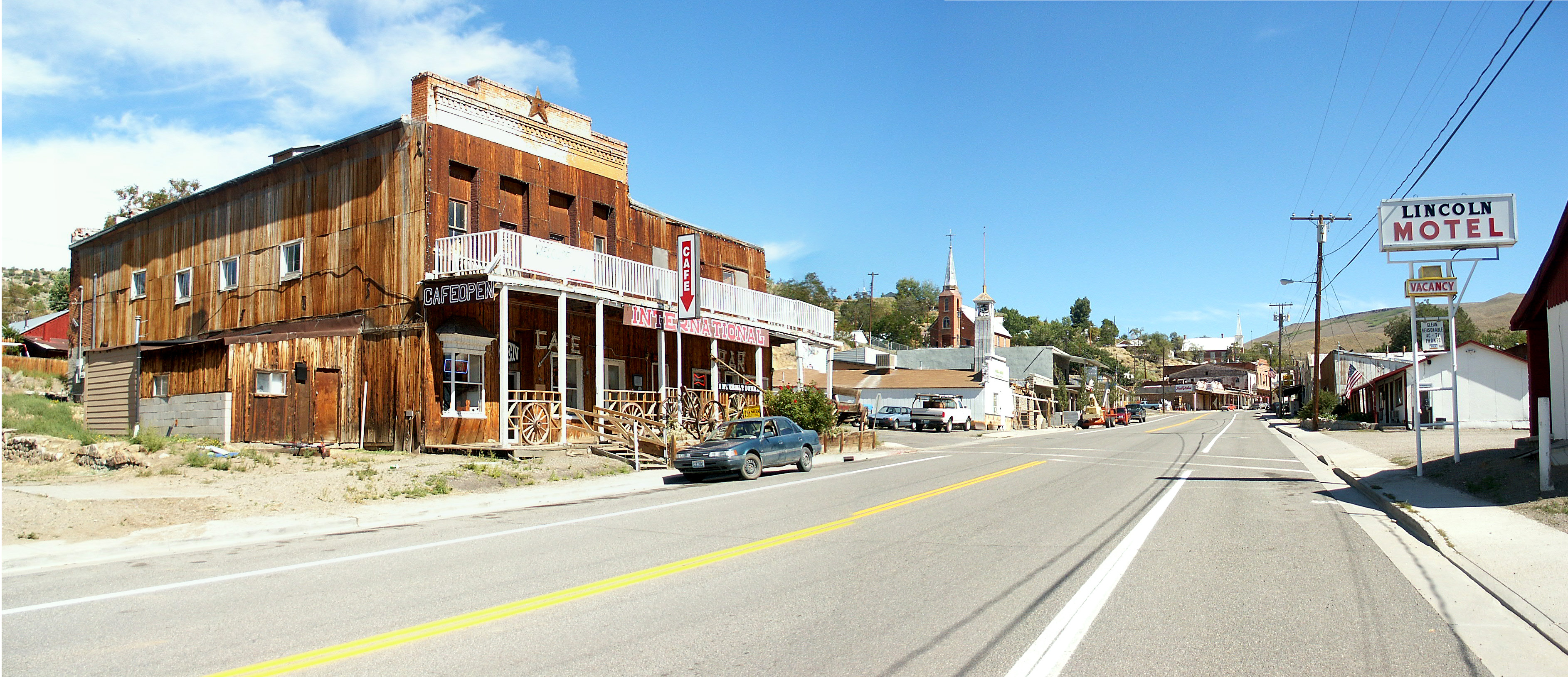 Keep the Show on the Road! Posted September 1, 2013 Report Share Posted September 1, 2013 Dale, Rick, Your descriptions fit my memory to a T! I never stayed at the Lincoln, and I'm sorry to hear that it wasn't up to snuff. It may well have improved since 2007. I note in the most recent review that a new manager has really improved the place a lot. I have added two panoramas below. The first is of the International and the Lincoln, looking down Austin's main street (the Lincoln Highway) 10 years ago almost to the day (9/3/2003). The second deserves attention because it is a classic view of the interior of the International. I draw your attention to a few details. The pay phone on the wall, the malted milk mixer behind the counter, the “fine art” on the far wall, the calendar on the same wall, the cracker basket and the free reading material on each table and at the counter, the pull tab dispenser on the far left, the red spin stools at the counter, the lazy susan on the table, and of course, my red squeeze ketchup bottle on the table. Who can spot additional classic symbols of the old time diner? (You can double click on the image to get a better squint.) Dave Keep the Show on the Road! Quote Link to comment Share on other sites More sharing options...