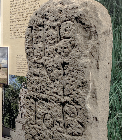 that were fitted with harness bells, and, later, in early Fords that struggled to climb uphill. Of particular interest is an original National Road stone mile marker. The limestone obelisk—pockmarked by decades of wind and rain—stood along the National Road near Flintstone, Maryland, until its removal was made necessary by the construction of modern Interstate 68. The inscription on its weathered face reads “119 M ToB”—which early travelers knew meant “119 miles to Baltimore.”